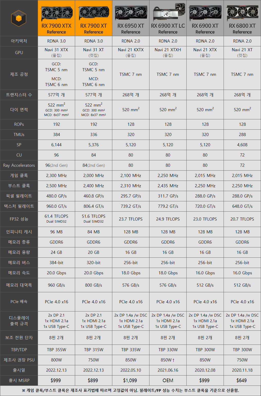 전 세대 그래픽 카드인 RX 6900 XT와 이번 출시된 RX 7900 XTX와 비교하면