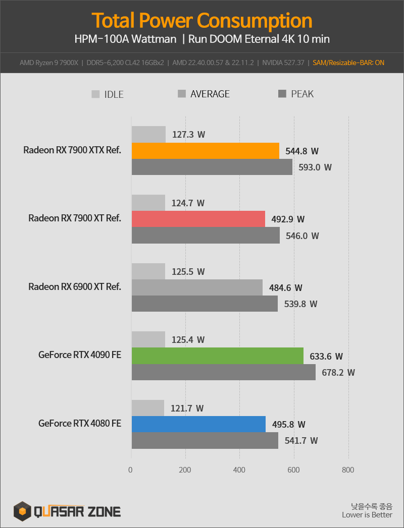4080과 비슷한 성능을 보여주는 7900 XTX는 오히려 더 많은 전력 소모를 하는 것을 볼 수 있음